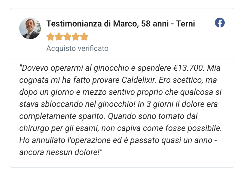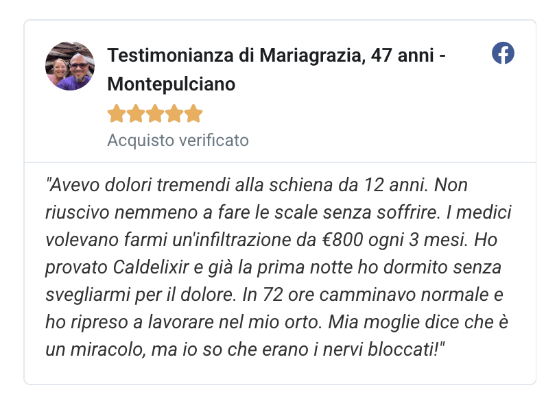“Il dolore al ginocchiomi tormentava da 22 anni… i neurologi volevano operarmi per €14.800per ‘liberare i nervi compressi’. Dopo solo 48 ore con questo riattivatore delle guaine nervose, il dolore è COMPLETAMENTE SCOMPARSO e la mia mielina articolare si è letteralmente ‘riattivata’. Quando ho mostrato al neurologo le mie nuove elettromiografie, è rimasto scioccato e mi ha chiesto dove avessi trovato questa tecnologia!”